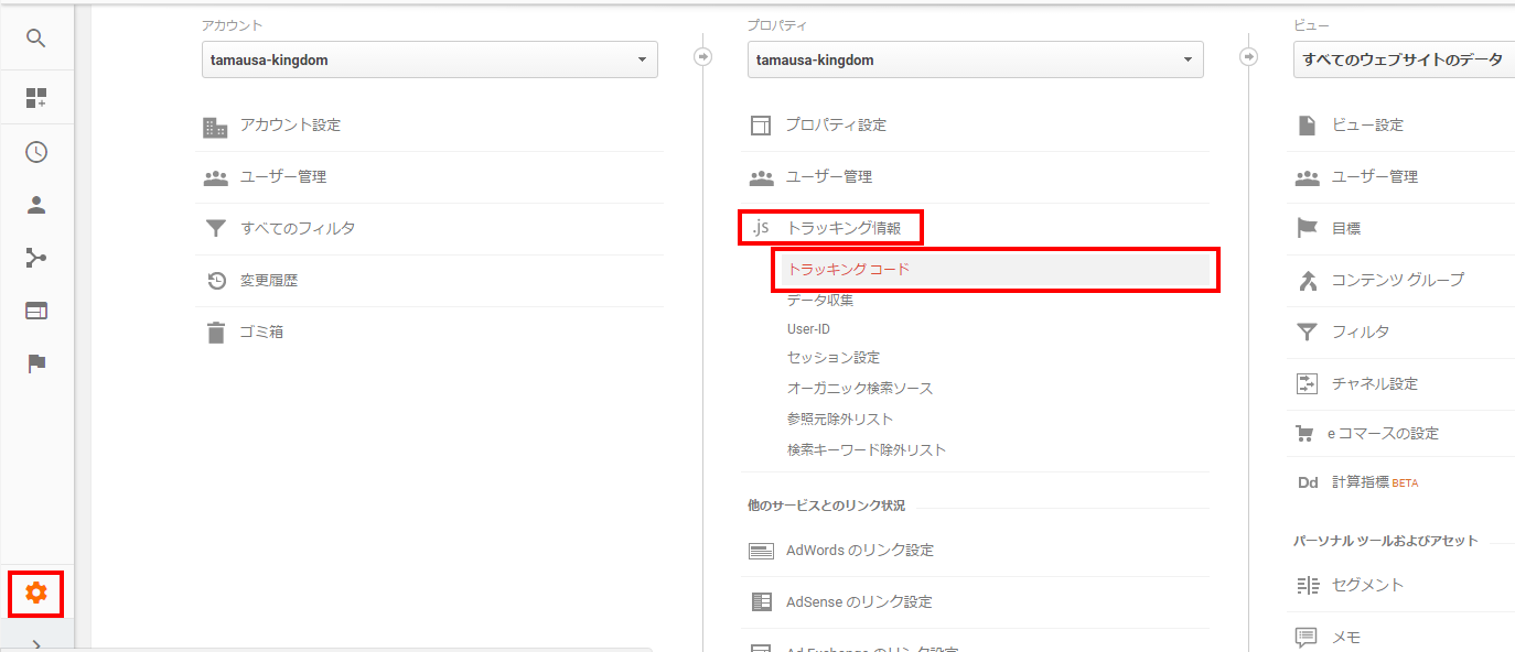 メニューから管理(歯車マーク)画面へ遷移し、設定したドメイン(プロパティ)のトラッキング情報→トラッキング情報→トラッキングコードをクリックします